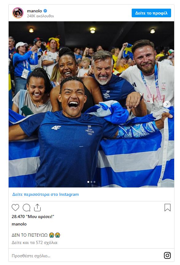 «ΔΕΝ ΤΟ ΠΙΣΤΕΥΩΩ» έγραψε σε ανάρτησή του στο Instagram ο χάλκινος Έλληνας Ολυμπιονίκης Εμμανουήλ Καραλής, ανεβάζοντας τρεις φωτογραφίες με τους συγγενείς και συνεργάτες του, μετά από το άλμα στα 5.90μ., που του χάρισε το χάλκινο μετάλλιο στον τελικό του άλματος επί κοντώ.