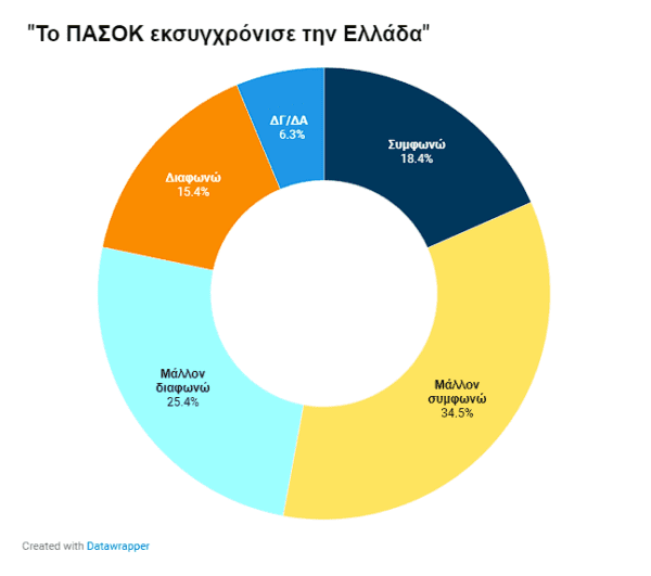 Από την άλλη, 6 στους 10 πιστεύουν ότι το ΠΑΣΟΚ έχει κλείσει τον κύκλο του. Ενδιαφέρον δε, έχουν και οι απαντήσεις για το αν “το ΠΑΣΟΚ χρεοκόπησε τη χώρα” και “αν το ΠΑΣΟΚ εκσυγχρόνισε τη χώρα”. 53,9% συμφωνεί με την πρώτη φράση, ενώ παρόμοιο ποσοστό (52,9%) συμφωνεί με τη δεύτερη.