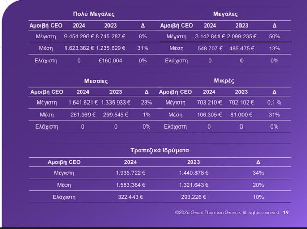Στις πολύ μεγάλες εταιρίες, η μέση αμοιβή CEO ξεπερνά τα 1,62 εκατ. ευρώ, στα τραπεζικά ιδρύματα τα 1,58 εκατ. ευρώ, ενώ στις μικρές είναι μόλις 106 χιλ. ευρώ. Η μέγιστη αμοιβή CEO στις πολύ μεγάλες εταιρίες έφτασε τα 9,45 εκατ. ευρώ, ενώ σε αρκετές περιπτώσεις (κυρίως μεσαίες και μικρές) η αμοιβή ήταν μηδενική. Η υψηλότερη διάμεσος αμοιβών CEO εντοπίζεται στον κλάδο Τηλεπικοινωνιών.
