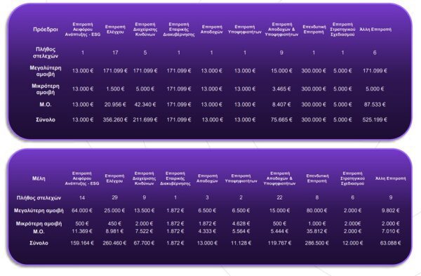 Περίπου το 81% των συνολικών αμοιβών κατευθύνεται σε εκτελεστικά στελέχη, με την αναλογία να φθάνει το 85% στις πολύ μεγάλες και τις μεσαίες επιχειρήσεις, και 86% στις μικρές. Μόνο στον τραπεζικό τομέα, όπου οι δομές εταιρικής διακυβέρνησης είναι πιο ώριμες, η αναλογία πέφτει στο 62:38.