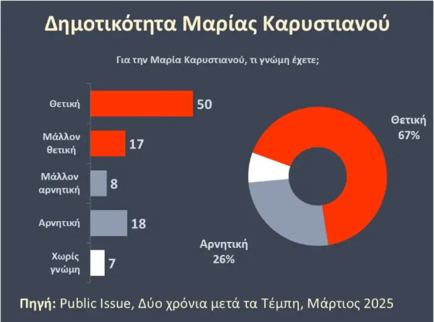 Στην πολιτική σκηνή, ξεχωρίζει η δημοτικότητα της Μαρίας Καρυστιανού, καθώς 67% των πολιτών διατηρούν θετική γνώμη για αυτήν, ενώ αρνητική άποψη έχει το 26%.