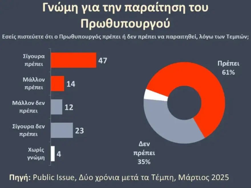 Η συντριπτική πλειοψηφία 70% των πολιτών αποδίδει ευθύνες σε όλα τα κόμματα που κυβέρνησαν τα τελευταία 25 χρόνια για την κατάσταση του σιδηροδρομικού δικτύου και την τραγωδία στα Τέμπη, με μεγαλύτερο ποσοστό ωστόσο, 76%, να εκτιμά ότι υπήρξε απόπειρα συγκάλυψης από την κυβέρνηση, σύμφωνα με την τελευταία έρευνα της Public Issue. Επίσης, το 61% των ερωτηθέντων θεωρεί πως τίθεται θέμα παραίτησης του πρωθυπουργού εξαιτίας της τραγωδίας και το 67% έχει θετική γνώμη για την Μαρία Καρυστιανού.