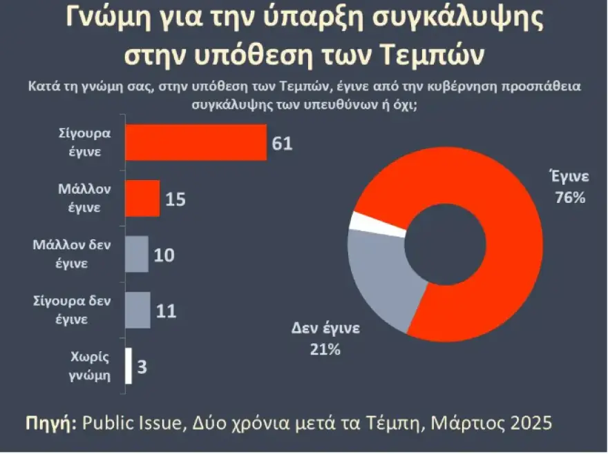 Παράλληλα, το 76% των πολιτών εκτιμά ότι υπήρξε απόπειρα συγκάλυψης από την κυβέρνηση στην υπόθεση των Τεμπών, με το 61% να δηλώνει απολύτως πεπεισμένο για αυτό.
