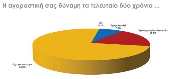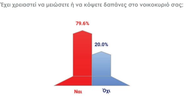 Παράλληλα, σχεδόν 8 στους 10 πολίτες έχουν αναγκαστεί να μειώσουν δαπάνες, ακόμη και σε βασικές κατηγορίες όπως τρόφιμα, ένδυση υπόδηση, ενέργεια και υπηρεσίες υγείας.