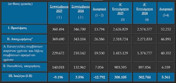 Από τη σύγκριση των στοιχείων των δύο μηνών, Σεπτέμβριος 2025 και Σεπτέμβριος 2024, προκύπτει αρνητική επίδοση κατά -12.792 λιγότερων θέσεων εργασίας για τον Σεπτέμβριο 2025 (αρνητικό ισοζύγιο -9.196 θέσεων εργασίας) έναντι θετικού ισοζυγίου (3.596) τον Σεπτέμβριο του 2024.