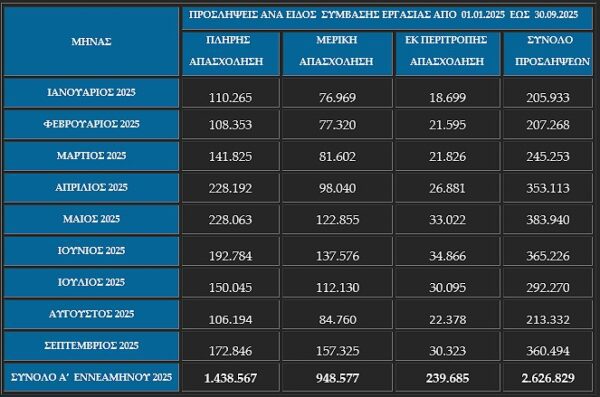 Αθροιστικά για την περίοδο Ιανουάριος – Σεπτέμβριος 2025, οι αναγγελίες προσλήψεων ανήλθαν στις 2.626.829 θέσεις εργασίας και οι αποχωρήσεις έφτασαν τις 2.318.724, εκ των οποίων οι 1.415.129 ήταν αποτέλεσμα καταγγελιών συμβάσεων αορίστου χρόνου ή λήξεων συμβάσεων ορισμένου χρόνου και οι 903.595 οικειοθελείς αποχωρήσεις.