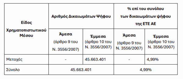 Η Εθνική Τράπεζα γνωστοποιεί ότι το συνολικό ποσοστό δικαιωμάτων ψήφου που κατέχει έμμεσα η “Principal Financial Group”, από την ημερομηνία που αυτά περιήλθαν στην κατοχή της “Principal Global Investors, LLC”, κατήλθε στις 13.10.2025 του ελάχιστου ορίου του 5% επί του συνόλου των δικαιωμάτων ψήφου της Τράπεζας.