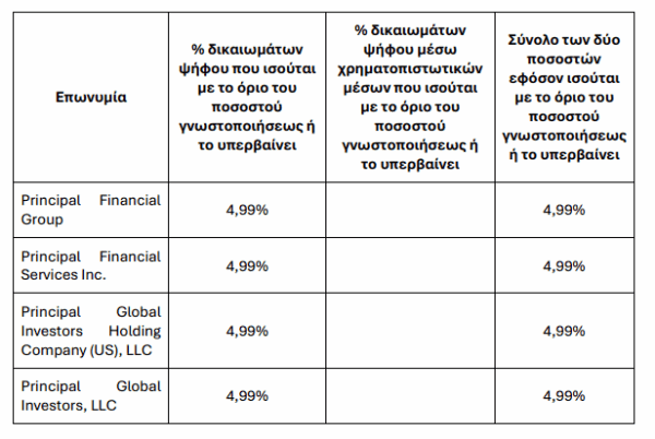 Πλέον η Principal Financial Group κατέχει 45.663.401 μετοχές και το ποσοστό της διαμορφώνεται στο 4,99%.