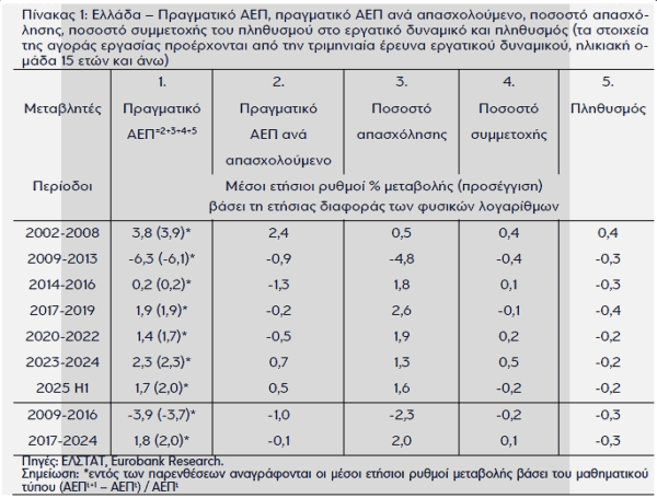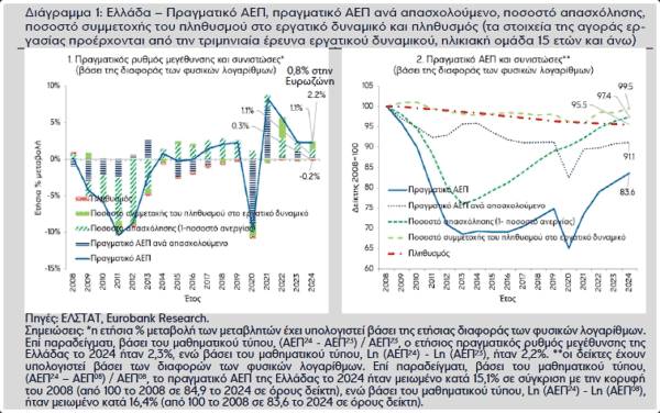 Την περίοδο της ανάκαμψης της ελληνικής οικονομίας (2017-2024), η μέση ετήσια μεταβολή του πραγματικού ΑΕΠ ήταν 1,8%. Η αύξηση του ποσοστού απασχόλησης, δηλαδή η μείωση του ποσοστού ανεργίας, εξηγεί σχεδόν εξ ολοκλήρου αυτό το αποτέλεσμα. Ο πληθυσμός συνέχισε να κινείται καθοδικά, ενώ η παραγωγικότητα της εργασίας το 2024 ήταν οριακά χαμηλότερη από τα επίπεδα του 2016. Εντούτοις, τα δυο τελευταία χρόνια (2023-2024), η μέση ετήσια αύξηση του πραγματικού ΑΕΠ (2,3%) δεν προήλθε μόνο από την ενίσχυση του ποσοστού απασχόλησης αλλά και από την αύξηση της παραγωγικότητας της εργασίας και του ποσοστού συμμετοχής του πληθυσμού στο εργατικό δυναμικό.