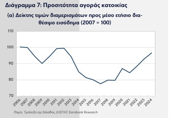 – Η άνοδος των τιμών των κατοικιών, ταχύτερη σε σχέση με τα εισοδήματα, έχει επιδεινώσει την προσιτότητά τους, η οποία ωστόσο παραμένει καλύτερη σε σχέση με την προ-κρίσης περίοδο και συγκρίσιμη – αν και λίγο μικρότερη – με την αντίστοιχη στις άλλες χώρες της ευρωζώνης.