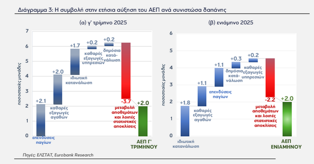 Θετικό είναι πάντως ότι οι καθαρές εξαγωγές σημείωσαν δυναμική ανάκαμψη στο εννεάμηνο του 2025, καταγράφοντας τη μεγαλύτερη συμβολή τους στην αύξηση του ΑΕΠ εννεαμήνου (+1,1 π.μ.) από το 2012, με εξαίρεση το «πανδημικό» έτος 2020. Ενθαρρυντική είναι και ανάκαμψη των επενδύσεων (+1,1 π.μ.), η οποία όμως θα πρέπει να ισχυροποιηθεί και να διατηρηθεί για να έχει θετικό αποτύπωμα στην παραγωγικότητα και τα εισοδήματα μεσοπρόθεσμα.