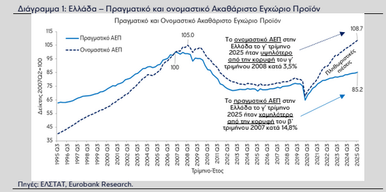Όπως παρουσιάζεται στο Διάγραμμα 1, το πραγματικό ΑΕΠ στην Ελλάδα το γ’ τρίμηνο 2025 ήταν χαμηλότερο από την κορυφή του β’ τριμήνου 2007 κατά 14,8%, ενώ το αντίστοιχο μέγεθος σε τρέχουσες τιμές, ωθούμενο και από τις πληθωριστικές πιέσεις των τελευταίων ετών, ξεπέρασε την κορυφή του γ’ τριμήνου 2008 κατά 3,5%. Ως μέτρο ευημερίας μιας οικονομίας, αν και με αρκετές ατέλειες, πάντα επιλέγεται το πραγματικό ΑΕΠ.