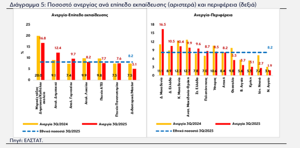 Με βάση το φύλο, τόσο στους άνδρες (6,2% από 7,0%, -0,8 π.μ.) όσο και στις γυναίκες (10,6% από 11,5%, -0,9 π.μ.) το ποσοστό ανεργίας παρουσιάζεται μειωμένο, ωστόσο το ποσοστό συμμετοχής στην αγορά εργασίας των γυναικών καθώς και των νέων ηλικίας 20-24 ετών (46,0% και 51,2% αντίστοιχα) παραμένουν χαμηλότερα από το εθνικό ποσοστό (53,3%). Ο αριθμός των μακροχρόνια ανέργων που από το δ’ τρίμηνο 2023 βρίσκεται κάτω από τους 300,0 χιλ., περιορίστηκε περαιτέρω σε ετήσια βάση το γ’ τρίμηνο 2025 κατά 11,2 χιλ. (στους 230,8 χιλ.) αλλά το ποσοστό μακροχρόνιας ανεργίας αυξήθηκε στο 58,7% από 56,5% ένα έτος νωρίτερα. Με βάση το επίπεδο εκπαίδευσης το χαμηλότερο ποσοστό ανεργίας εντοπίζεται στους κατόχους Διδακτορικού/Μεταπτυχιακού (5,1% από 7,5%) και το υψηλότερο σε άτομα που παρακολούθησαν μερικές τάξεις Δημοτικού/Δεν πήγαν καθόλου σχολείο (16,8% από 20,0%). Σημειώνεται πως σε τρεις κατηγορίες (πτυχίο ανώτατων σχολών, απολυτήριο Γυμνασίου, απολυτήριο Δημοτικού) το ποσοστό ανεργίας αυξήθηκε (στο 7,6%, 9,7% και 12,4%, αντίστοιχα) και στις υπόλοιπες τέσσερις μειώθηκε.