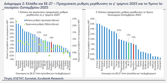 Στο 9μηνο Ιανουαρίου-Σεπτεμβρίου 2025 ο ετήσιος πραγματικός ρυθμός μεγέθυνσης της Ελλάδας ήταν ο 10ος υψηλότερος ανάμεσα στις χώρες της ΕΕ-27 και ο 7ος υψηλότερος ανάμεσα στις χώρες της Ευρωζώνης.