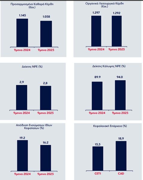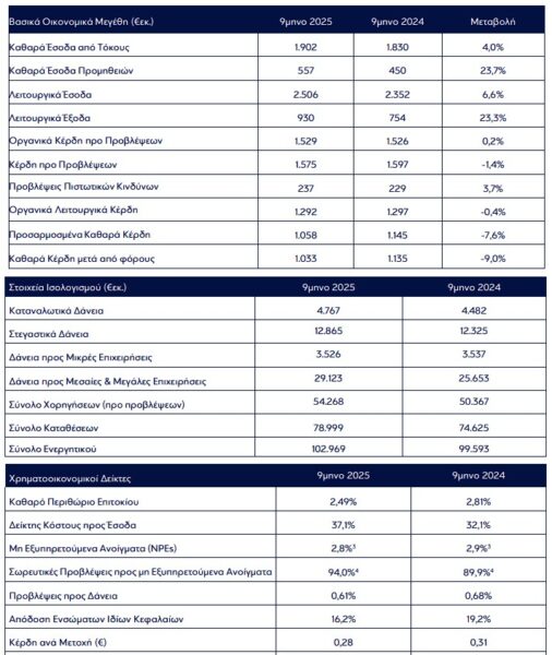 ▪ Τα οργανικά κέρδη προ προβλέψεων αυξήθηκαν σε ετήσια βάση κατά 0,2% σε €1.529εκ, ενώ τα συνολικά κέρδη προ προβλέψεων μειώθηκαν έναντιτου εννεαμήνου 2024 κατά 1,4%σε €1.575εκ.