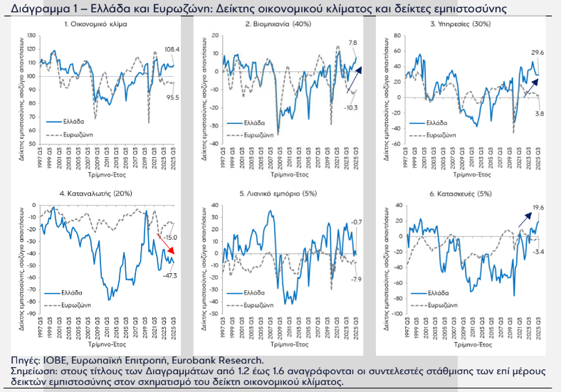 Βάσει της μεθοδολογίας της Ευρωπαϊκής Επιτροπής, ο δείκτης οικονομικού κλίματος συντίθεται από 5 δείκτες εμπιστοσύνης με διαφορετικούς συντελεστές στάθμισης ο καθένας. Αυτοί καλύπτουν τους παρακάτω τομείς της οικονομίας: βιομηχανία (40% στάθμιση στη διαμόρφωση του γενικού δείκτη), υπηρεσίες (30%), καταναλωτής (20%), λιανικό εμπόριο (5%) και κατασκευές (5%). Οι δείκτες εμπιστοσύνης που οδήγησαν σε βελτίωση του δείκτη οικονομικού κλίματος στην Ελλάδα το γ’ τρίμηνο 2025 ήταν εκείνοι της βιομηχανίας και των κατασκευών, ενώ επιδείνωση κατέγραψαν οι αντίστοιχοι δείκτες του καταναλωτή και του λιανικού εμπορίου. Τέλος, ο δείκτης εμπιστοσύνης των υπηρεσιών παρέμεινε οριακά στα ίδια επίπεδα με εκείνα του β’ τριμήνου 2025, επίπεδα τα οποία είναι αρκετά υψηλά σε σχέση με τη μακροχρόνια πορεία του δείκτη.