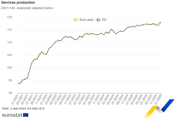 Τον Ιανουάριο του 2026, σε σύγκριση με τον Δεκέμβριο του 2025, η εποχικά προσαρμοσμένη παραγωγή υπηρεσιών αυξήθηκε κατά 1,2% στη ζώνη του ευρώ και κατά 0,6% στην ΕΕ , ενώ τον Δεκέμβριο του 2025, η παραγωγή υπηρεσιών παρέμεινε σταθερή στη ζώνη του ευρώ και αυξήθηκε κατά 0,4% στην ΕΕ .
