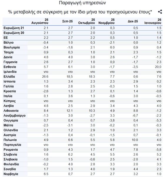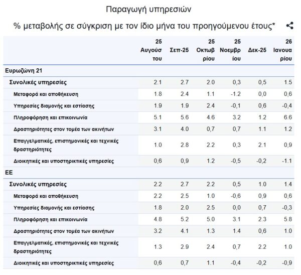 Στη ζώνη του ευρώ τον Ιανουάριο του 2026, σε σύγκριση με τον Ιανουάριο του 2025, η παραγωγή υπηρεσιών
