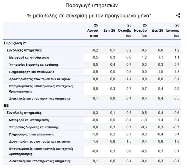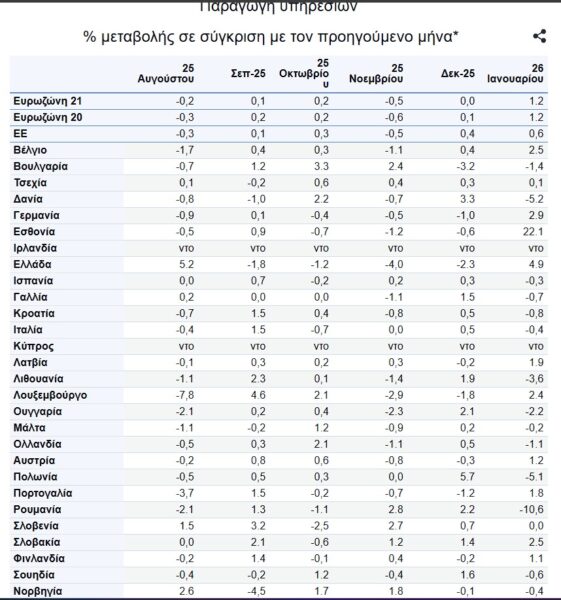 Στη ζώνη του ευρώ τον Ιανουάριο του 2026, σε σύγκριση με τον Δεκέμβριο του 2025, η παραγωγή υπηρεσιών