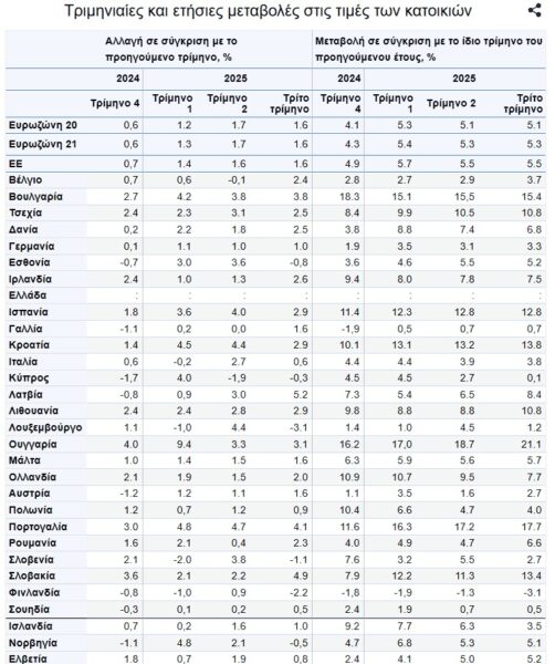 Το β΄ τρίμηνο του 2025, οι τιμές των κατοικιών αυξήθηκαν κατά 5,1% και 5,5% στη ζώνη του ευρώ και στην ΕΕ , αντίστοιχα. Τα στοιχεία αυτά προέρχονται από την , τη στατιστική υπηρεσία της Ευρωπαϊκής Ένωσης .