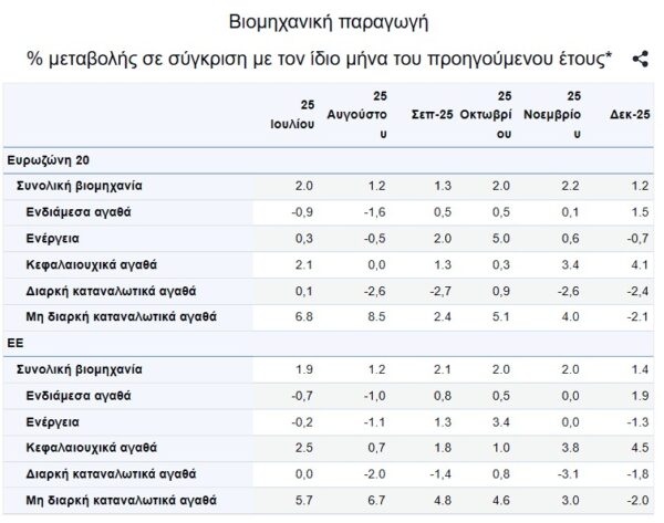 Τον Δεκέμβριο του 2025, σε σύγκριση με τον Δεκέμβριο του 2024, η βιομηχανική παραγωγή αυξήθηκε κατά 1,2% στη ζώνη του ευρώ και κατά 1,4% στην ΕΕ, ενώ η μέση ετήσια βιομηχανική παραγωγή για το έτος 2025, σε σύγκριση με το 2024, αυξήθηκε κατά 1,5% τόσο στη ζώνη του ευρώ όσο και στην ΕΕ, σύμφωνα με τις πρώτες εκτιμήσεις της Eurostat.