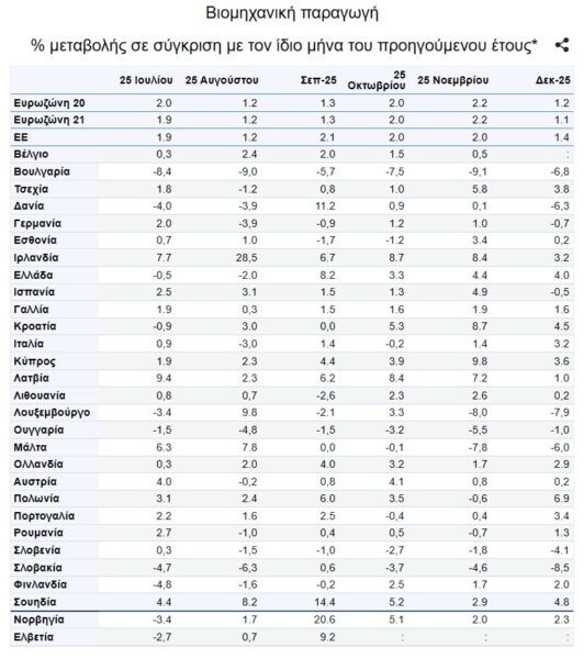 Στην Ελλάδα η βιομηχανική παραγωγή τον Δεκέμβριο αυξήθηκε κατά 4% σε σχέση με τον αντίστοιχο μήνα του 2024 (-0,5%) και μειώθηκε οριακά από τον Νοέμβριο του 2025 (+4,4%).