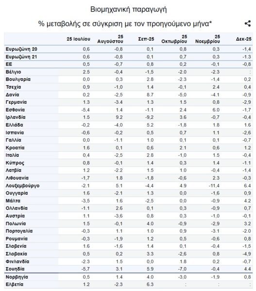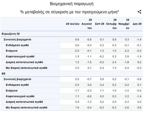 Στη ζώνη του ευρώ τον Δεκέμβριο του 2025, σε σύγκριση με τον Νοέμβριο του 2025, η βιομηχανική παραγωγή