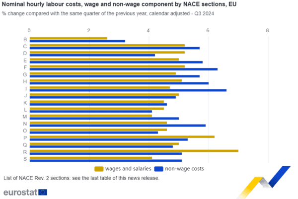 Στην ΕΕ , το τρίτο τρίμηνο του 2024 σε σύγκριση με το ίδιο τρίμηνο του προηγούμενου έτους, η οικονομική δραστηριότητα (τμήματα NACE Αναθ. 2) που κατέγραψε τις υψηλότερες αυξήσεις στη μη μισθολογική συνιστώσα ήταν:
