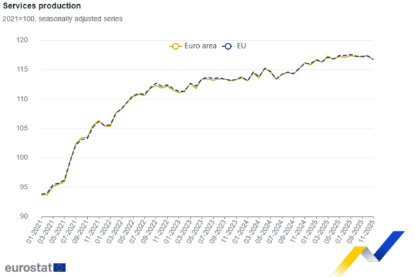 Τον Νοέμβριο του 2025, σε σύγκριση με τον Οκτώβριο του 2025, η εποχικά προσαρμοσμένη παραγωγή υπηρεσιών μειώθηκε κατά 0,6% στη ζώνη του ευρώ και κατά 0,5% στην ΕΕ , ενώ τον Οκτώβριο του 2025, η παραγωγή υπηρεσιών αυξήθηκε κατά 0,1% τόσο στη ζώνη του ευρώ όσο και στην ΕΕ .