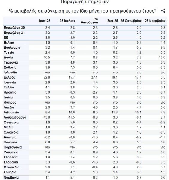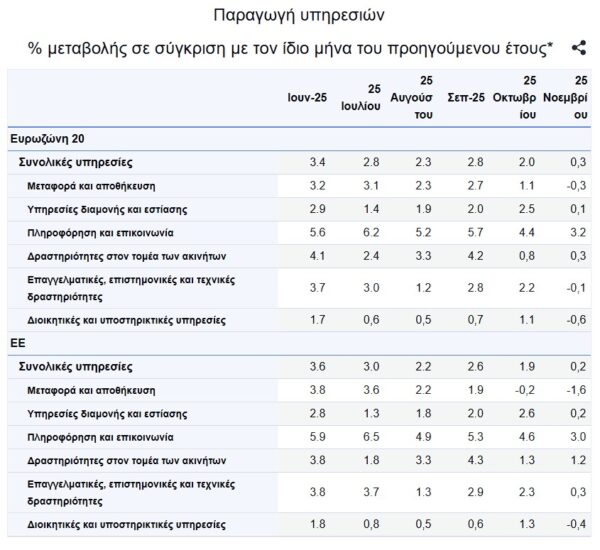 Στη ζώνη του ευρώ τον Νοέμβριο του 2025, σε σύγκριση με τον Νοέμβριο του 2024, η παραγωγή υπηρεσιών