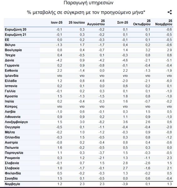 Στη ζώνη του ευρώ τον Νοέμβριο του 2025, σε σύγκριση με τον Οκτώβριο του 2025, η παραγωγή υπηρεσιών