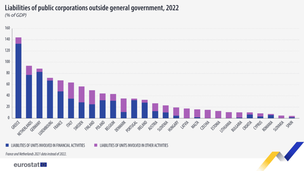 Τρομάζει το ύψος των υποχρεώσεων των δημοσίων επιχειρήσεων στην Ελλάδα, σύμφωνα με στοιχεία που δημοσιοποίησε σήμερα η Eurostat. Το χρέος, το 2022 έφτασε στη χώρα μας το 144,1% του ΑΕΠ, μπροστά από τις Κάτω Χώρες (93,5%), τη Γερμανία (88,4%), το Λουξεμβούργο (72,0%) και τη Γαλλία (67,5%).