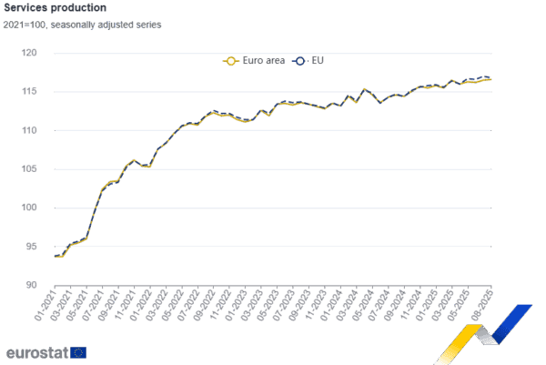 Τον Αύγουστο του 2025, σε σύγκριση με τον Ιούλιο του 2025, η εποχικά προσαρμοσμένη παραγωγή υπηρεσιών αυξήθηκε κατά 0,1% στη ζώνη του ευρώ και μειώθηκε κατά 0,2% στην ΕΕ, ενώ τον Ιούλιο του 2025, η παραγωγή υπηρεσιών αυξήθηκε κατά 0,3% τόσο στη ζώνη του ευρώ όσο και στην ΕΕ .