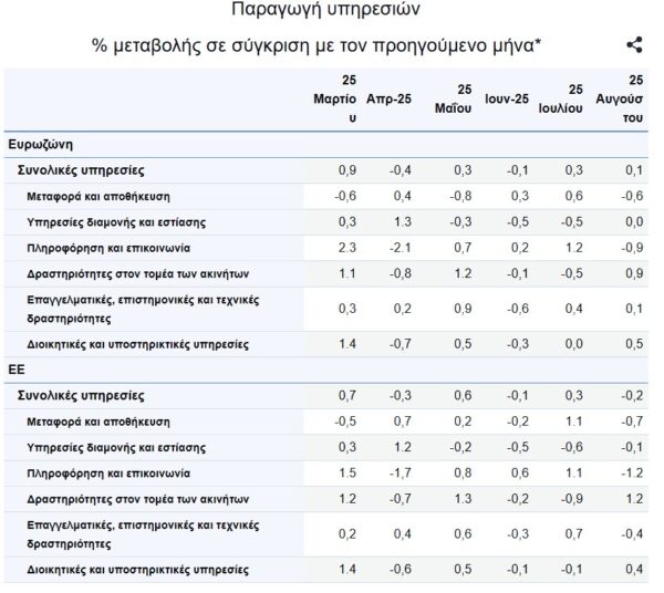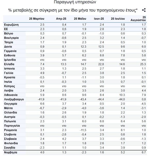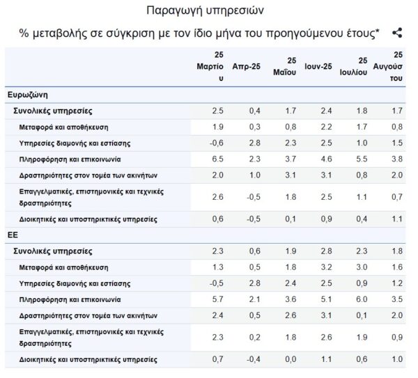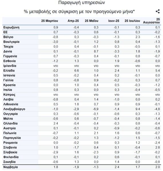 Ανά κλάδο, τη μεγαλύτερη αύξηση κατέγραψε η ενημέρωση και επικοινωνία κατά 3,8% στην ευρωζώνη και 3,5% στην ΕΕ Μηνιαία σύγκριση ανά κλάδο υπηρεσιών και ανά κράτος μέλος Στη ζώνη του ευρώ τον Αύγουστο του 2025, σε σύγκριση με τον Ιούλιο του 2025, η παραγωγή υπηρεσιών μειώθηκε για μεταφορά και αποθήκευση κατά 0,6%, παρέμεινε σταθερό για υπηρεσίες στέγασης και εστίασης, μειώθηκε για την ενημέρωση και την επικοινωνία κατά 0,9%, αυξήθηκε για τις δραστηριότητες στον τομέα των ακινήτων κατά 0,9%, αυξήθηκε για επαγγελματικές, επιστημονικές και τεχνικές δραστηριότητες κατά 0,1%, αυξήθηκε για διοικητικές και υποστηρικτικές υπηρεσίες κατά 0,5%. Στην ΕΕ , η παραγωγή υπηρεσιών μειώθηκε για μεταφορά και αποθήκευση κατά 0,7%, μειώθηκε για υπηρεσίες διαμονής και εστίασης κατά 0,1%, μειώθηκε για την ενημέρωση και την επικοινωνία κατά 1,2%, αυξήθηκε για τις δραστηριότητες στον τομέα των ακινήτων κατά 1,2%, μειώθηκε για επαγγελματικές, επιστημονικές και τεχνικές δραστηριότητες κατά 0,4%, αυξήθηκε για διοικητικές και υποστηρικτικές υπηρεσίες κατά 0,4%. Μεταξύ των κρατών μελών για τα οποία υπάρχουν διαθέσιμα στοιχεία, οι υψηλότερες μηνιαίες αυξήσεις καταγράφηκαν στην Ελλάδα (+5,4%), τη Σλοβενία (+2,8%) και τη Γαλλία (+0,7%). Οι μεγαλύτερες μειώσεις παρατηρήθηκαν στο Λουξεμβούργο (-4,8%), τη Ρουμανία (-2,4%) και τη Δανία (-1,9%).