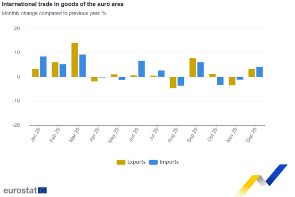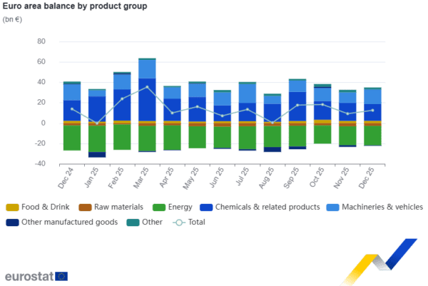 Οι πρώτες εκτιμήσεις του ισοζυγίου της ζώνης του ευρώ έδειξαν πλεόνασμα 12,6 δισ. ευρώ στο εμπόριο αγαθών με τον υπόλοιπο κόσμο τον Δεκέμβριο του 2025, σε σύγκριση με + 13,9 δισ. ευρώ τον Δεκέμβριο του 2024, όπως ανακοίνωσε η Eurostat.