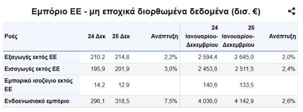 Το ενδοκοινοτικό εμπόριο αυξήθηκε στα 4.142,9 δισ. ευρώ τον Ιανουάριο-Δεκέμβριο του 2025, +2,6% σε σύγκριση με τον Ιανουάριο-Δεκέμβριο του 2024.