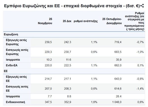 Τον Δεκέμβριο του 2025, σε σύγκριση με τον Νοέμβριο του 2025, οι εποχικά προσαρμοσμένες εξαγωγές της ζώνης του ευρώ αυξήθηκαν κατά 1,1%, ενώ οι εισαγωγές αυξήθηκαν κατά 0,6%. Το εποχικά προσαρμοσμένο ισοζύγιο ανήλθε σε 11,6 δισ. ευρώ, σημειώνοντας αύξηση σε σύγκριση με τον Νοέμβριο (10,2 δισ. ευρώ).