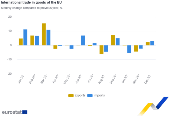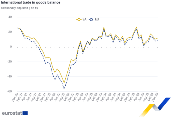 Το ισοζύγιο της ΕΕ παρουσίασε πλεόνασμα 12,9 δισ. ευρώ στο εμπόριο αγαθών με τον υπόλοιπο κόσμο τον Δεκέμβριο του 2025, σε σύγκριση με +14,2 δισ. ευρώ τον Δεκέμβριο του 2024.
