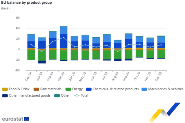 Τον Δεκέμβριο του 2025, το ισοζύγιο της ΕΕ αυξήθηκε σε σύγκριση με τον Νοέμβριο του 2025, φτάνοντας σε συνολικό πλεόνασμα 12,9 δισ. ευρώ. Σε σύγκριση με τον Δεκέμβριο του 2024, το ισοζύγιο της ΕΕ μειώθηκε κατά 1,3 δισ. ευρώ. Αυτή η αλλαγή μπορεί να αποδοθεί στη μείωση του πλεονάσματος σε τρεις ομάδες: χημικά και συναφή προϊόντα, όπου το πλεόνασμα μειώθηκε από 19,7 δισ. ευρώ τον Δεκέμβριο του 2024 σε 16,2 δισ. ευρώ τον Δεκέμβριο του 2025· άλλα μεταποιημένα προϊόντα, που μετατοπίστηκαν από πλεόνασμα 1,0 δισ. ευρώ σε έλλειμμα 1,9 δισ. ευρώ· μηχανήματα και οχήματα, με το πλεόνασμα να μετατοπίζεται από 18,3 δισ. ευρώ σε 16,3 δισ. ευρώ. Αντίθετα, ο ενεργειακός τομέας παρουσίασε βελτίωση, με το έλλειμμα να μειώνεται από -28,0 δισ. ευρώ τον Δεκέμβριο του 2024 σε -21,9 δισ. ευρώ τον Δεκέμβριο του 2025.