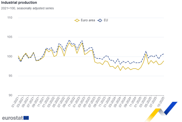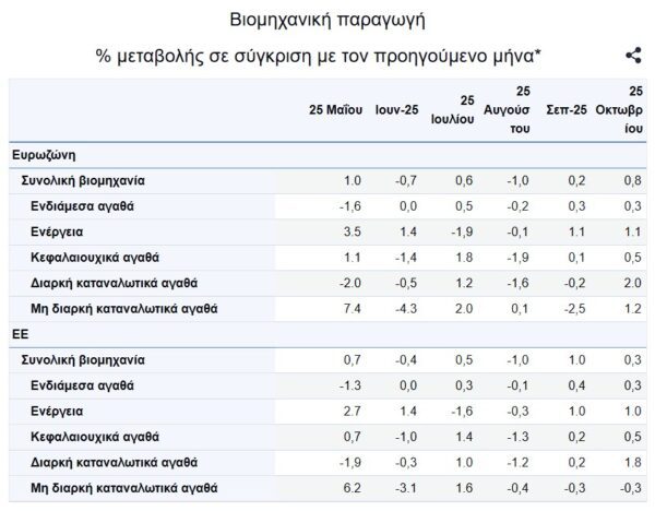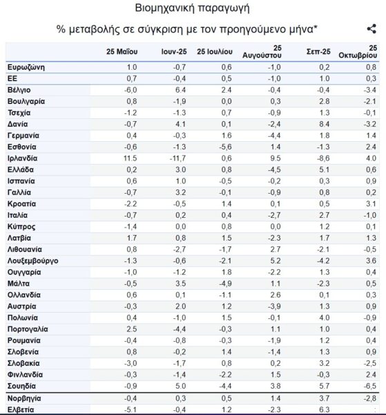 Στη ζώνη του ευρώ τον Οκτώβριο του 2025, σε σύγκριση με τον Σεπτέμβριο του 2025, η βιομηχανική παραγωγή