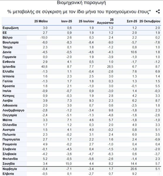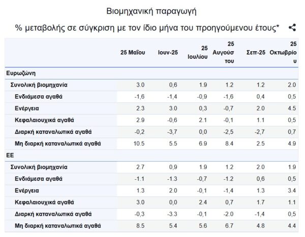 Τον Οκτώβριο του 2025, σε σύγκριση με τον Οκτώβριο του 2024, η βιομηχανική παραγωγή αυξήθηκε κατά 2,0% στην ευρωζώνη και κατά 1,9% στην ΕΕ, σύμφωνα με τις πρώτες εκτιμήσεις της Eurostat, με τη χώρα μας να καταγράφει τη δεύτερη υψηλότερη αύξηση κατά 6,9%.