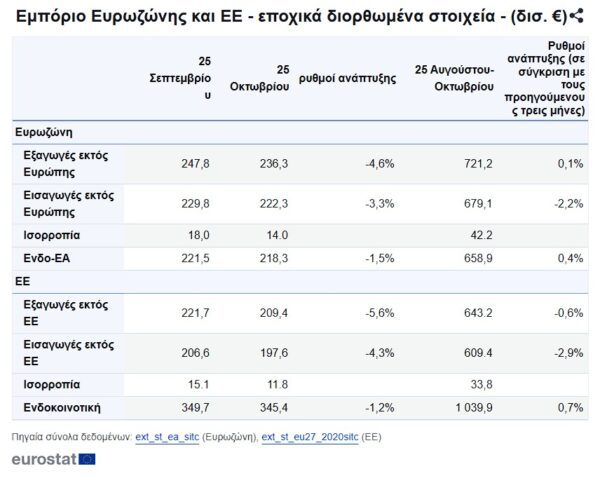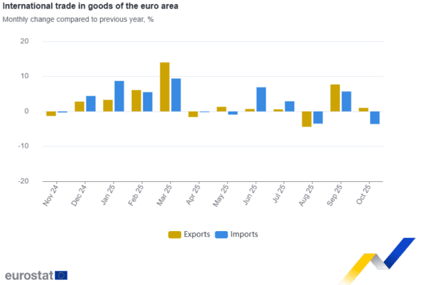 Την περίοδο Αυγούστου-Οκτωβρίου 2025, οι εξαγωγές της ζώνης του ευρώ προς χώρες εκτός Ευρωζώνης αυξήθηκαν κατά 0,1%, ενώ οι εισαγωγές μειώθηκαν κατά 2,2%. Το εμπόριο εντός της ζώνης του ευρώ αυξήθηκε κατά 0,4%. Κατά την ίδια περίοδο, οι εξαγωγές της ΕΕ προς χώρες εκτός ΕΕ μειώθηκαν κατά 0,6%, ενώ οι εισαγωγές μειώθηκαν κατά 2,9%. Το εμπόριο εντός της ΕΕ αυξήθηκε κατά 0,7%.