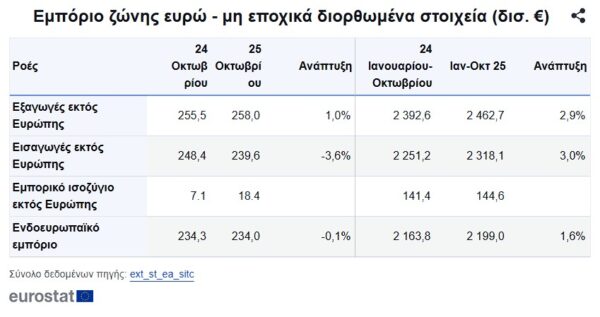 Από τον Ιανουάριο έως τον Οκτώβριο του 2025, η ζώνη του ευρώ κατέγραψε πλεόνασμα 144,6 δισ. ευρώ, σε σύγκριση με 141,4 δισ. ευρώ τον Ιανουάριο-Οκτώβριο του 2024.