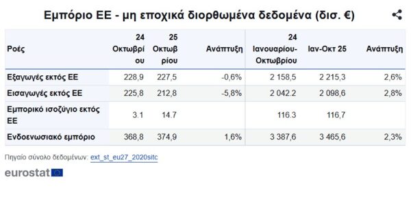 Το ενδοκοινοτικό εμπόριο αυξήθηκε στα 3.465,6 δισ. ευρώ τον Ιανουάριο-Οκτώβριο του 2025, +2,3% σε σύγκριση με τον Ιανουάριο-Οκτώβριο του 2024.