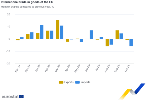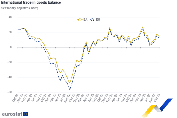 Το ισοζύγιο της ΕΕ παρουσίασε πλεόνασμα 14,7 δισ. ευρώ στο εμπόριο αγαθών με τον υπόλοιπο κόσμο τον Οκτώβριο του 2025, σε σύγκριση με +3,1 δισ. ευρώ τον Οκτώβριο του 2024.