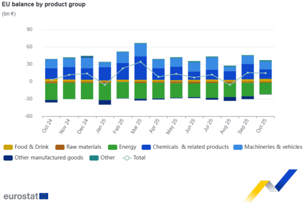 Τον Οκτώβριο του 2025, το ισοζύγιο της ΕΕ παρουσίασε μείωση σε σύγκριση με τον Σεπτέμβριο του 2025, με το συνολικό πλεόνασμα να μειώνεται από 15,4 δισ. ευρώ σε 14,7 δισ. ευρώ. Αυτή η αλλαγή οφείλεται κυρίως στη μείωση του πλεονάσματος των χημικών προϊόντων και των συναφών προϊόντων, το οποίο μειώθηκε από 26,5 δισ. ευρώ τον Σεπτέμβριο του 2025 σε 16,4 δισ. ευρώ τον Οκτώβριο του 2025. Ωστόσο, η μείωση του συνολικού ισοζυγίου μετριάστηκε εν μέρει από μειώσεις των ελλειμμάτων τόσο για την ενέργεια (από -23,2 δισ. ευρώ σε -19,9 δισ. ευρώ) όσο και για άλλα μεταποιημένα προϊόντα (από -5,0 δισ. ευρώ σε -0,5 δισ. ευρώ).