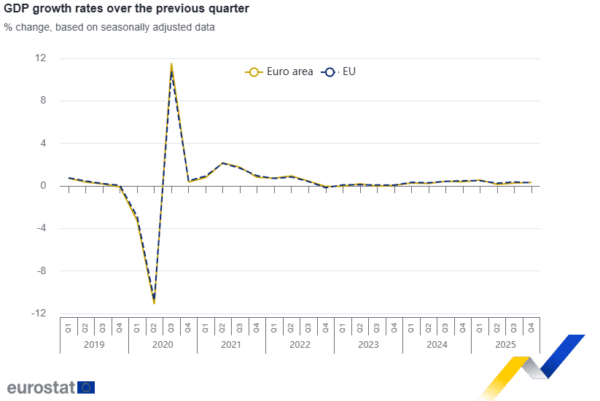 Το δ΄ τρίμηνο του 2025, το εποχικά προσαρμοσμένο ΑΕΠ αυξήθηκε κατά 0,3% τόσο στη ζώνη του ευρώ όσο και στην ΕΕ , σε σύγκριση με το προηγούμενο τρίμηνο, σύμφωνα με προκαταρκτική εκτίμηση που δημοσίευσε η Eurostat.
