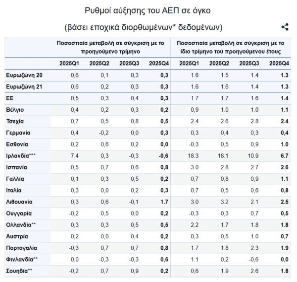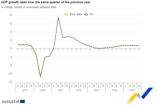 Σε σύγκριση με το ίδιο τρίμηνο του προηγούμενου έτους, το εποχικά διορθωμένο ΑΕΠ αυξήθηκε κατά 1,3% στη ζώνη του ευρώ και κατά 1,4% στην ΕΕ το τέταρτο τρίμηνο του 2025, μετά από +1,4% στη ζώνη του ευρώ και +1,6% στην ΕΕ το προηγούμενο τρίμηνο.