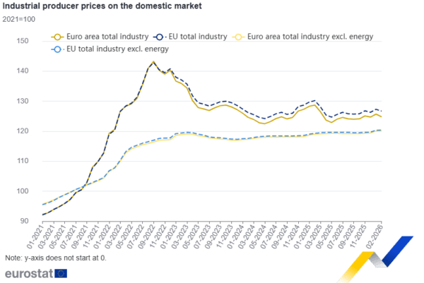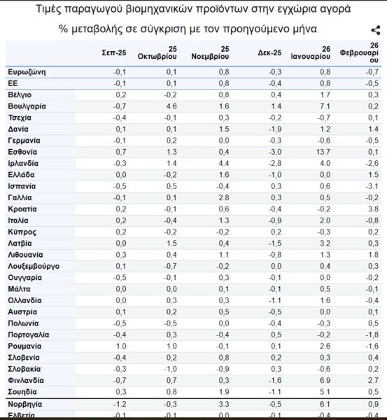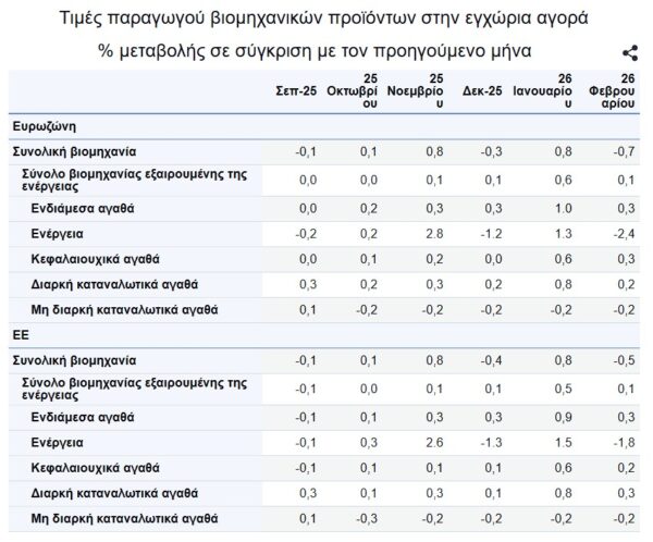 Στη ζώνη του ευρώ τον Φεβρουάριο του 2026, σε σύγκριση με τον Φεβρουάριο του 2025, οι τιμές παραγωγού βιομηχανικών προϊόντων