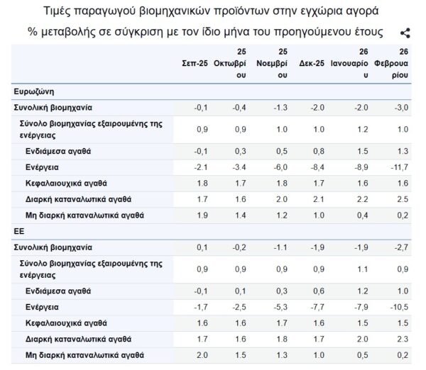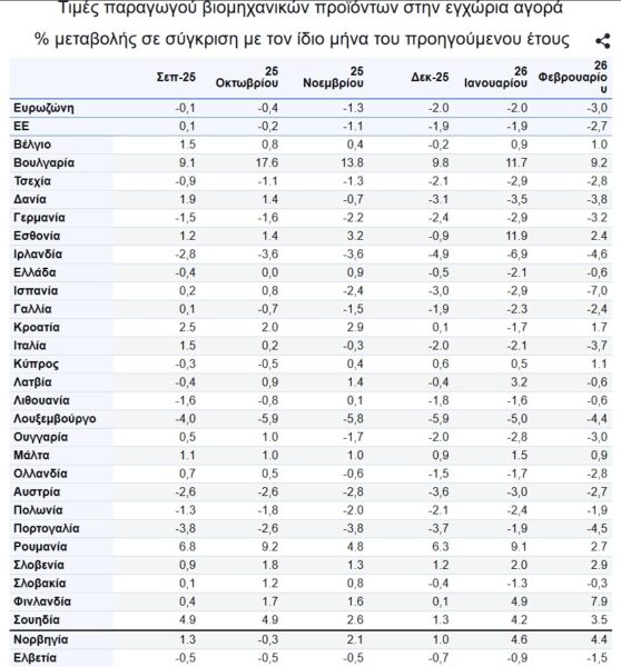 Τον Φεβρουάριο του 2026, σε σύγκριση με τον Φεβρουάριο του 2025, οι τιμές παραγωγού βιομηχανικών προϊόντων μειώθηκαν κατά 3,0% στη ζώνη του ευρώ και κατά 2,7% στην ΕΕ, σύμφωνα με τις πρώτες εκτιμήσεις της Eurostat.